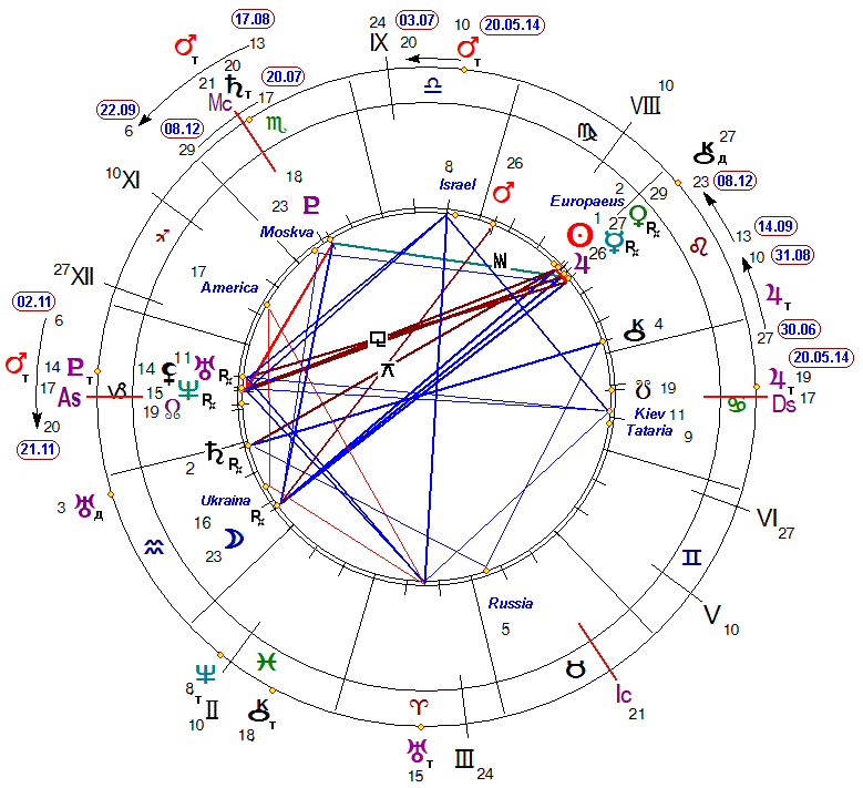И эти действия из-за квадрата транзитного Марса с радиксными Юпитером (вера, мораль, большие деньги, важные чиновники, сановники, богачи, судьи), Меркурием (замыслы, решения, учащаяся молодежь, техническая интеллигенция), Венерой (чувства, симпатии-антипатии, искусство, творческая интеллигенция) в 25°59, 26°01, 28°08 Льва и Солнцем (инициативы, власти), астероидом Europaeus (Европейский союз) в 0°57 и 1°36 Девы в 7 Доме партнеров и явных врагов будут связаны с финансовыми (Юпитер) вопросами, мнением прозападной интеллигенции (Меркурий и Венера, 7 Дом), инициативами прозападных властей (Солнце, 7 Дом) и Евросоюза (астероид Europaeus). Это будет проявляться в период с 31.08 по 15.09 для радиксного Юпитера, с 31.08 по 15.09 для Меркурия, с 03.09 по 18.09 для Венеры, с 7.09 по 22.09 для Солнца и с 09.09 по 24.09 для астероида Europaeus, т.е. в общей сложности с 31.08 по 24.09.2014 года.