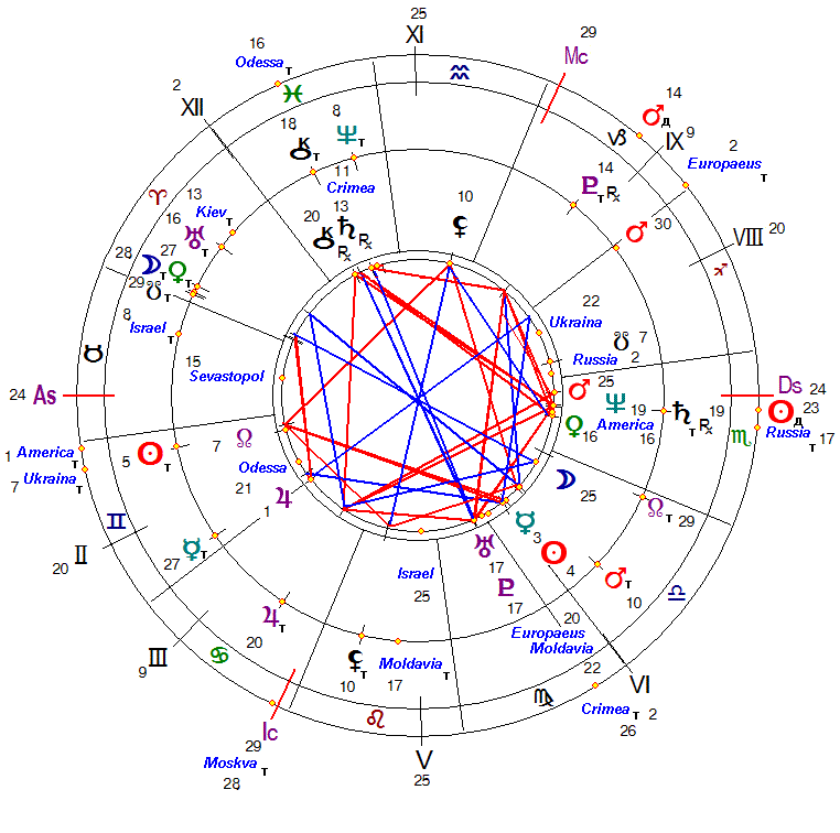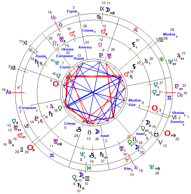 На последнее также указывает квадрат транзитных Венеры (симпатии, оценка ситуаций, социум), Луны (эмоции, простые люди, народ) и Южного Узла Луны (прошлые задачи и опыт) в 26°04, 27°32 и 28°03 импульсивного Овна в 4 Доме родных земель, семьи и недвижимости, а также оппозиция транзитного астероида Moskva (Москва) в 27°42 Рака на куспиде 8 Дома чужих финансов и политики с дирекционным Солнцем (воля, власть) в 28°31 Козерога во 2 Доме собственных финансов и богатств.