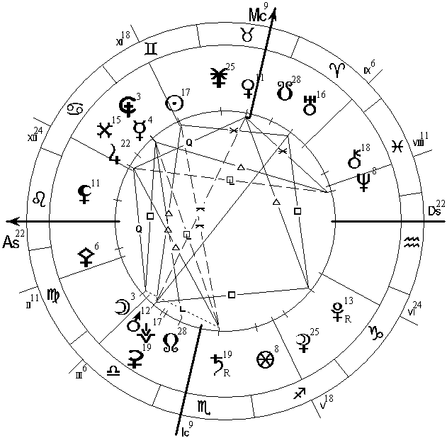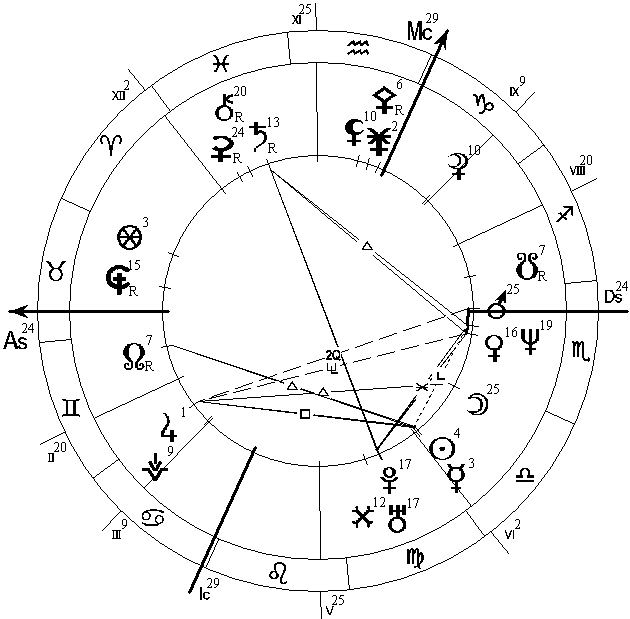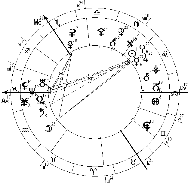 Дирекционная Луна из 2 Дома начинает формировать трин к своему натальному насильнику Плутону с орбисом в 1 градус 20 минут. Поскольку Луна управляет 7 Домом, то можно предположить, взаиморасчеты с партнерами и открытыми врагами — получение каких-то средств или только посулов (все же Луна в Рыбах) взамен передачи власти и контроля (Плутон в Скорпионе в 9 Доме дальних стран) над своим народом (Луна) или какими-то материальными ресурсами (2 Дом).