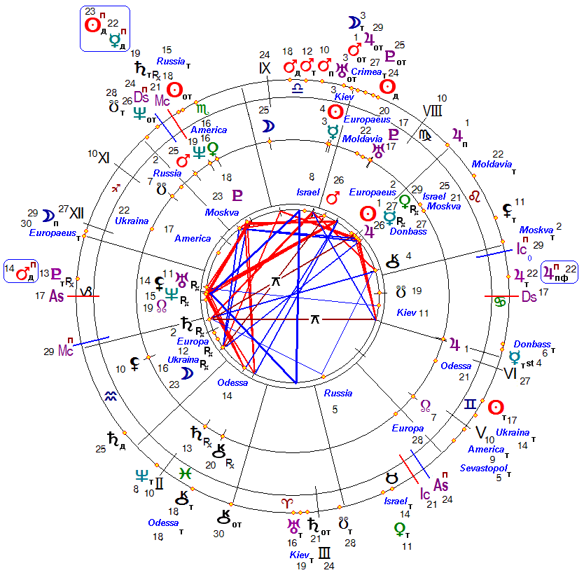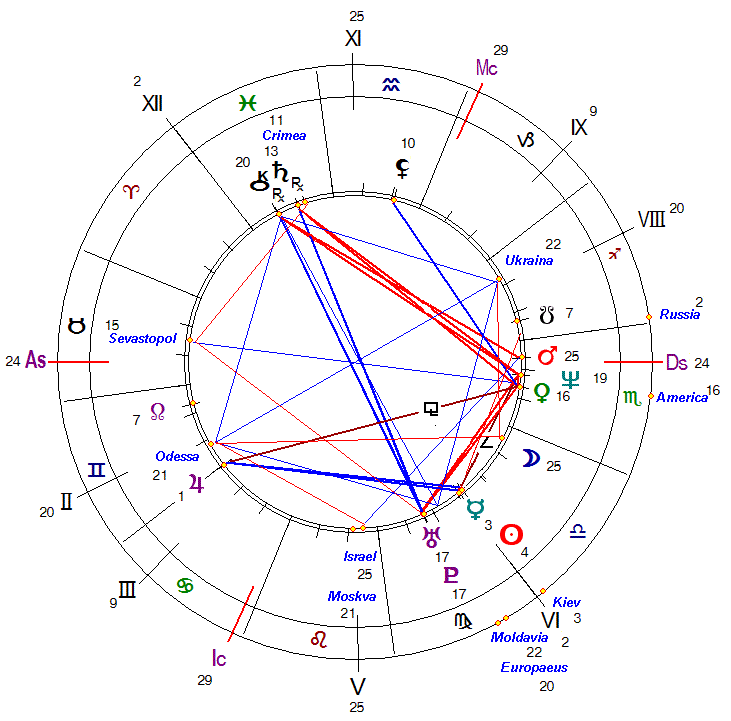 Венера (любовь, оценка ситуаций, сладости) в 6 Доме образует соединение с астероидом America (Америка) и Нептуном (тайны, секреты, интуиция, махинации, обман) в 15°39 и 18°08 Скорпиона, секстиль с Ураном (неожиданности, новации, изобретательность, восстания, бунты) и Плутоном (рок, глубинная психология, управление массами, олигархи, мафия, спецслужбы), а через Нептун секстиль и с астероидами Europaeus (Европейский союз) и Moldavia (Молдавия) в 16°23, 16°44, 19°46 и 21°45 рациональной Девы в 5 Доме любви, детей, творчества, искусства, спекуляций, выборов, трин с астероидом Crymea (Крым), Сатурном (ограничения, препятствия, терпение, концентрация, дисциплина, честность, строгий отец) и Хироном (странности, двойственности, наставник) в 10°49, 12°20 и 19°37 размытых Рыб в 11 Доме надежд, друзей по идеалам и старших братьев, оппозиция с астероидом Sevastopol (Севастополь) в 14°53 Тельца в 12 Доме тайн, изоляции и секретов.