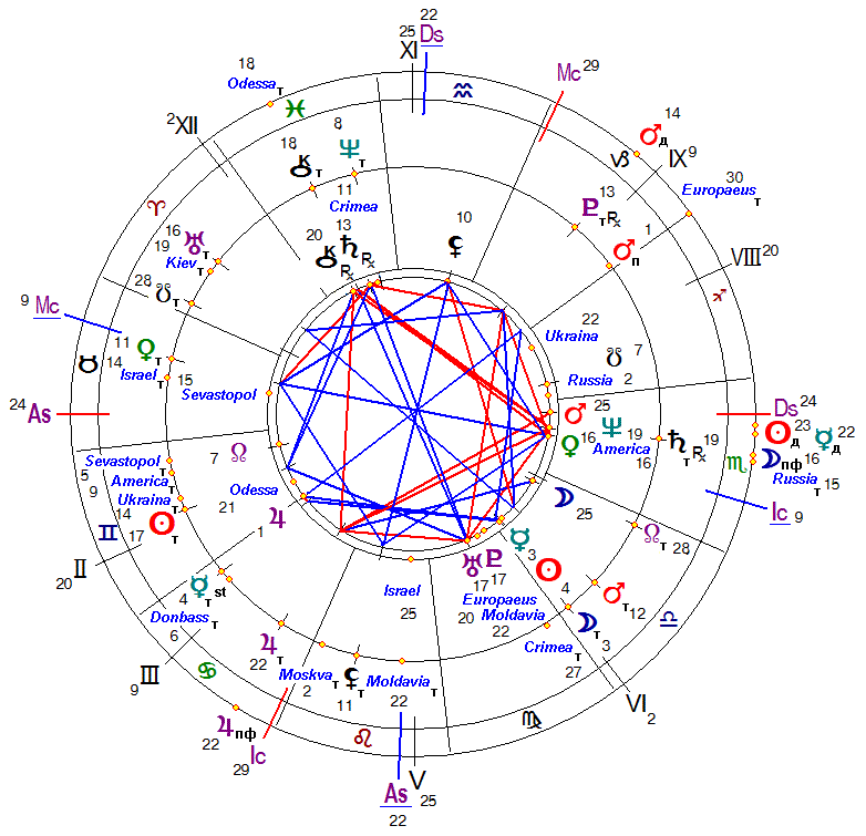 Ситуация еще больше отягощается тем, что обратнотранзитный (прошлые дела) Нептун (неясности, махинации, обман, тайны, секреты, нефть, газ, национализм) в 25°56 Скорпиона в 10 Доме властей образует квадраты к радиксной Луне (простой народ) и дирекционному Сатурну (ограничения, препятствия, строгий закон, давление, лишения, беды) в 22°23 и 24°19 Водолея в 1 Доме и к радиксным Юпитеру (вера, мораль, большие деньги), Меркурию (замыслы, решения, заявления), астероиду Donbass (Донбасс), Венере (чувства, симпатии-антипатии, оценка ситуаций) в 25°59, 26°01, 26°56, 28°08 Льва в 7 Доме других стран, партнеров и явных врагов, формируя Тау-квадрат.