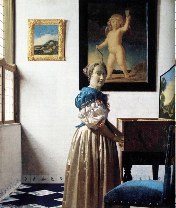 На стене пейзаж в золоченой раме и большая картина с амуром. Взгляд Амура, как и взгляд женщины, обращен напрямую к зрителю. Сюжет картины с амуром связан с гравюрой из популярной книги эмблем Отто ван Вейна, опубликованной в 1608 году в Антверпене. На ней Амур держит в руке табличку с цифрой «1», наступая ногой на таблички с другими числами. Надпись под эмблемой гласит «Любовь — только для одного». На переднем плане стоит обитый бархатом пустой стул, повернутый к зрителю, как бы приглашая его занять это место. Передний план вообще очень важен для понимания картин Вермеера. Пространство полностью освещено и прозрачно. Женщине у вирджинала нечего скрывать.