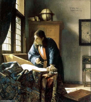 В «Географе» в интерьере, очень похожем на комнату «Астронома», молодой человек с циркулем в руке склонился над столом, заваленным картами и книгами. Его взгляд сосредоточен на определенной точке, как у задумавшегося человека. Задумчивость, мысленное сосредоточение связано именно с соединением Меркурия с Сатурном. Ученый, кажется, на минуту поднял голову, чтобы произвести необходимые вычисления. Цируль, который он держит в руке, служил для измерения расстояний, на стуле лежит угломер. Кабинет характерен для географа. Тот же шкаф, изображенный на картине «Астроном», стоит в том же углу у окна. На нем — несколько книг и тот же небесный глобус, что и в «Астрономе».