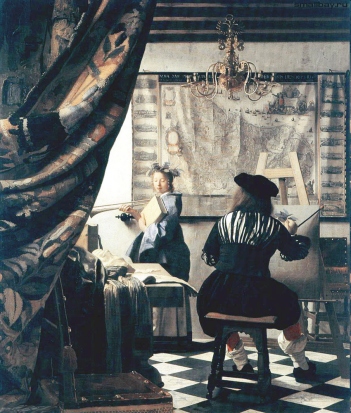 Перед нами мастерская художника. Ровный свет озаряет комнату, изящную бронзу люстры, которую венчает двуглавый орел Габсбургов, и висящую на стене огромную карту голландских провинций, до разделения в 1608 году. Линия сгиба на карте показывает границу между протестантской Голландией и католической Фландрией, все еще остававшейся под властью Испании.