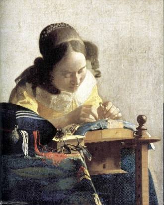 На маленькой картине «Кружевница» (1669-70) девушка, начинающая работать над кружевом, размещена на первом плане. Все внимание сконцентрировано на ее фигуре Она прислонилась к маленькому рабочему столику. Все ее внимание полностью сконцентрировано на работе, на движении рук. Занятие требует полной концентрации внимания, одно неверное движение — и вся работа будет испорчена. Перед ней рабочие инструменты: подушечка для вышивания, иглы, швейные челноки, нитки. Вышивальный станок часто изображался как символ трудолюбия и домашней добродетели. Присутствие на столе маленькой книжечки, вероятно молитвенника, усиливает добродетельный образ девушки.