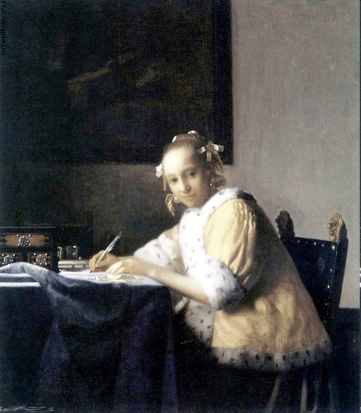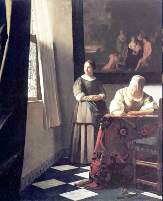 В картине «Дама и служанка с письмом» (1668) служанка отдает письмо хозяйке, которая прервала написание собственного послания, положив руку, и смотрит на домработницу, поднеся ладонь к подбородку. Вермеер передает жесты обеих женщин со свойственной ему непринужденностью, показывая отношения двух женщин: служанка выглядит осведомленной о важности заботливо передаваемого послания, а на лице дамы, сконцентрированной на смысле собственного письма, появляется заинтересованность словами служанки. Темный фон позволяет сконцентрировать взгляд на фигурах и связан с включением Сатурна.