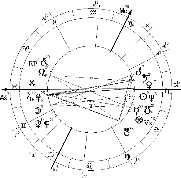 Рис. 1. Гороскоп Вермеера, род. 30.10.1632 г., 16:30 GMT, Делфт (52.00.43 с.ш., 4.21.34 в.д.), Дома Плацидуса
