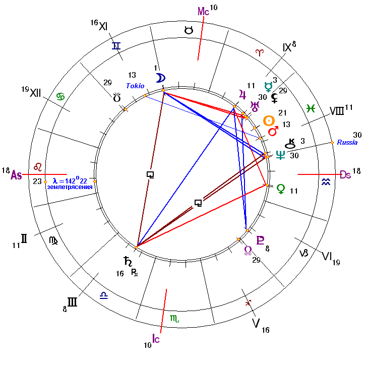 Указанием на мощное землетрясение является квадрат Юпитера (широта, объем) в 10°08 Овна в 9 Доме мировоззрения, идеологии и дальних стран с Плутоном (подземная стихия) в 7°17 Козерога в 5 Доме. Плутон же является управителем 4 Дома территорий, земель, строений в Скорпионе. Кроме того, Юпитер (сигнификатор веры) пребывает в оппозиции с сигнификатором земной тверди Сатурном в 15°38 знака справедливости Весов, где Сатурн находится в экзальтации, а потому особенно силен. Этот аспект сразу поднимает вопрос о землетрясении как о воздаянии (Юпитер) по закону кармы (Сатурн), хотя это звучит и очень непривычно. Однако совсем недавно Япония вновь активно и весьма воинственно требовала возвращения от России Курильских островов, и ее претензии достаточно прямо поддержали США.
