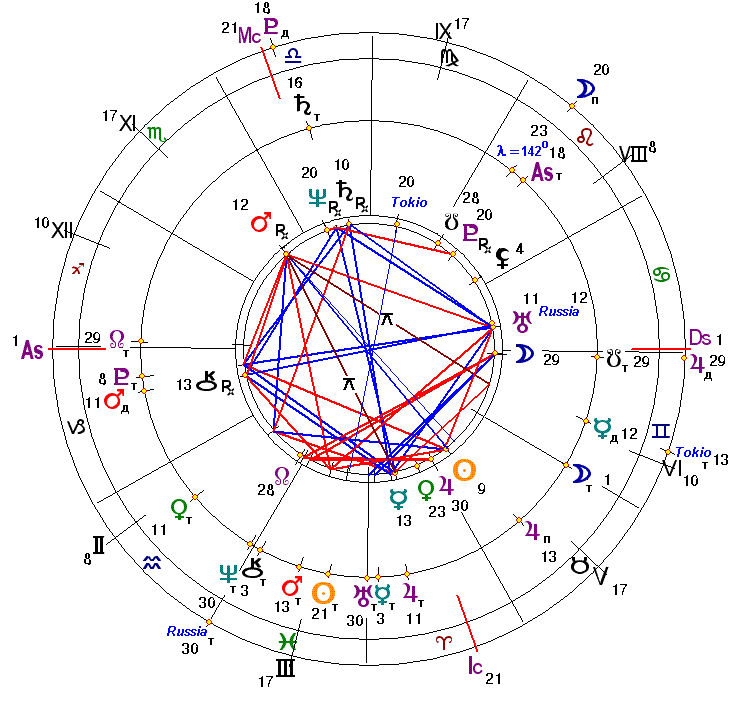 Еще более наглядной в части происшедшей 11.03.2011 г. серии землетрясений является карта официального восстановления независимости и суверенитета Японии в момент провозглашения мира между Японией и США 28.04.1952 г. в 13:30 по Гринвичу с транзитными (индекс «т»), прогрессивными (индекс «п»), дирекционными (индекс «д») планетами на момент землетрясения, приведенная на рис. 2. На ней также показаны положения астероидов Russia и Tokio.