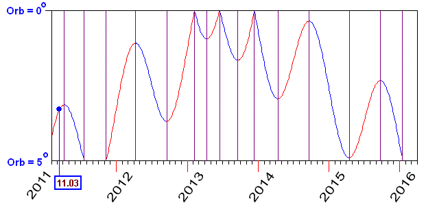 Кроме того, и транзитный Плутон (глобальные процессы, АЭС) при орбисе 5° будет формировать оппозицию с радиксным Ураном (землетрясения) Японии в течение 2012-2016 годов. Динамика изменения этого аспекта приведена на рис. 3.