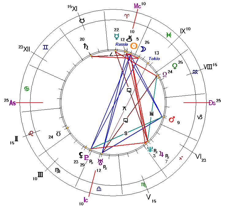 Радиксные Уран и астероид Russia в Раке образуют квадрат с ретроградным Сатурном в 9°39 Весов в 9 Доме идеологии, что делает Россию идеальным идеологическим (9 Дом) противником Японии, на котором можно в полную меру испытывать жесткую (Сатурн) патриотическую (Рак) идеологию (9 Дом), настаивая на «законном» (Сатурн, Весы) возврате (ретроградность) Россией (астероид Russia) «исконно японских» северных (Сатурн) территорий (Рак).