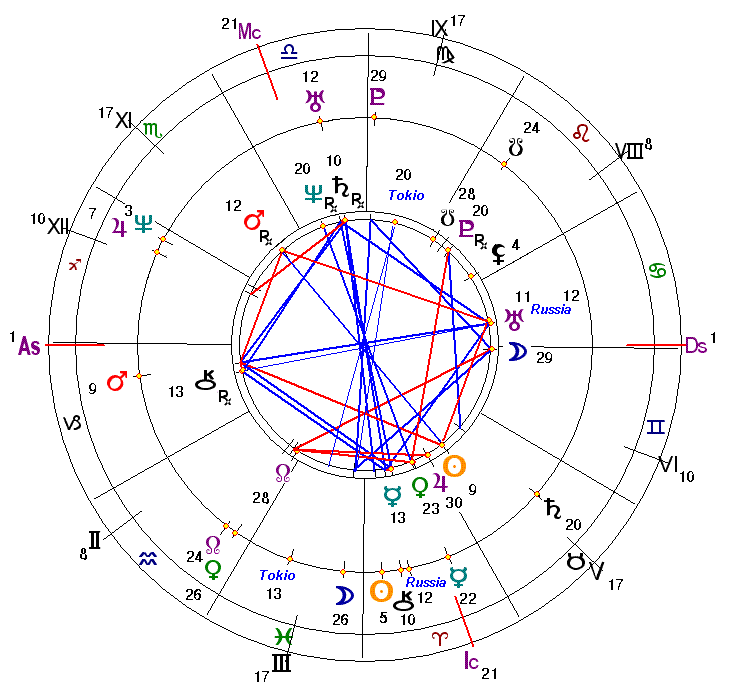 Квадрат радиксных Урана и астероида Russia в 7 Доме с радиксным Меркурием в 12°13 Овна в 3 Доме коммуникаций, уличных шествий обуславливает многие антироссийские (астероид Russia, 7 Дом) агрессивные и воинственные (Овен) публикации, заявления, демонстрации и шествия (3 Дом) японцев, включая и молодежь (Меркурий). Оппозиция Урана и астероида Russia с радиксным Хироном (странности, двойственности) в 12°26 Козерога в 1 Доме самовыражения страны делает конфликт и противостояние с Россией способом самопроявления (1 Дом) японской государственности (Козерог).