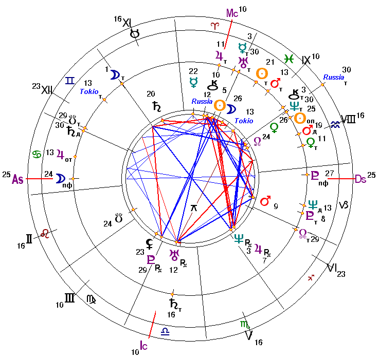 Интересно, что Уран в 11°50 Весов на (IC оказался в точной оппозиции с астероидом Russia в 11°25 Овна на МС. В этой оппозиции вновь можно увидеть намек на эзотерическую связь обострений (Овен) отношений (Весы) Японии с Россией (астероид Russia) с состоянием дел на АЭС при землетрясениях (Уран) и нарушениях электроснабжения (Уран).
