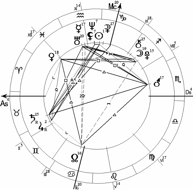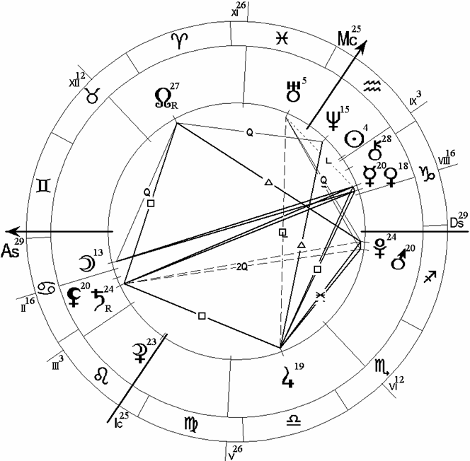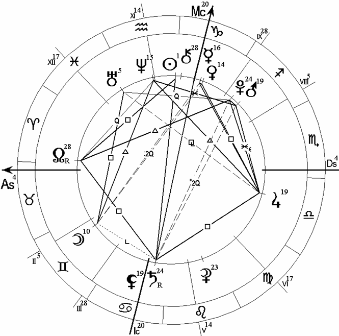 В этой карте сразу бросается в глаза тау-квадрат из ретроградного Сатурна, находящегося в Тельце и 1 Доме и образующего оппозицию к Марсу в Скорпионе и 7 Доме. На вершине этого тау-квадрата расположено соединение Меркурия с Ураном в Водолее и 11 Доме. Напряженную картину дополняет квадратура Венеры из Рыб и 12 Дома к соединению Луны с Плутоном в Стрельце и 8 Доме.